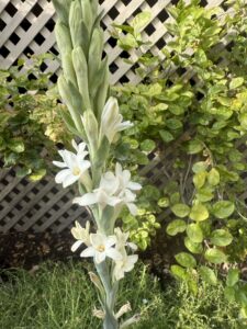 Tuberoses (Polianthes tuberosa), also known as Rajnigandha in India, are tall spikes holding waxy white flowers with a captivating, sensuous fragrance. However, they are not